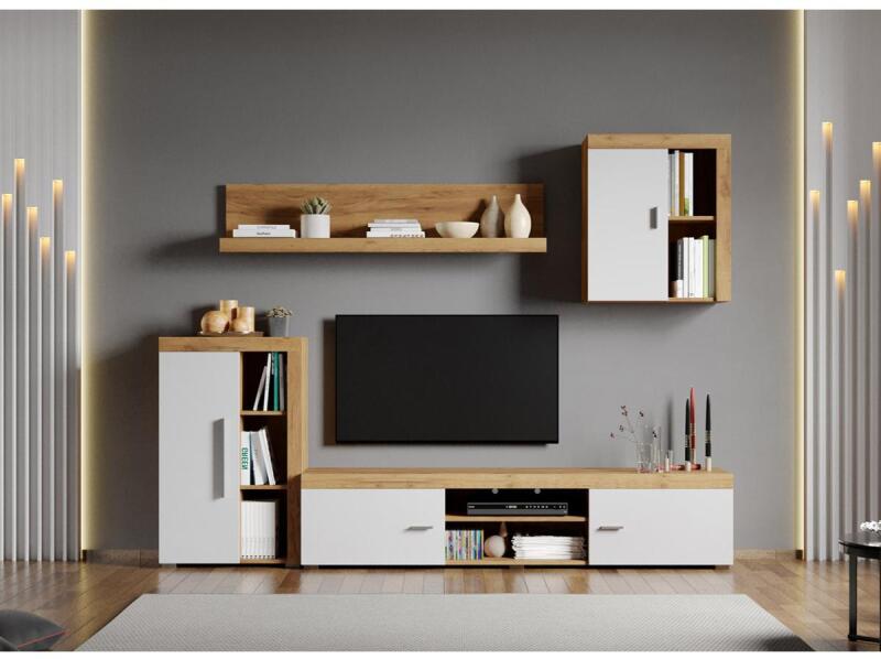 Crispy-C01 mintával fehér nappali bútor szett, aranytölgy  A Crispy szekrénysor modern és letisztult megjelenésével tökéletes választás minden stílusos nappaliba. A fehér és aranytölgy színkombináció frissességet és melegséget sugároz, könnyen illeszkedik bármilyen enteriőrbe. A praktikus elrendezésű alsó szekrények, nyitott és zárt tárolóelemek, valamint a lebegő polc és faliszekrény elegendő helyet biztosítanak a mindennapi tárgyaknak, könyveknek, díszeknek. A TV alatti szekrény nyitott és zárt része ideális médiaeszközök számára. A kompakt, mégis funkcionális kialakítás kis és nagyobb terekben is kiválóan mutat. A Crispy termékcsalád eleganciát és rendezettséget visz az otthonodba – stílus kompromisszumok nélkül. Külső méretek (teljes):