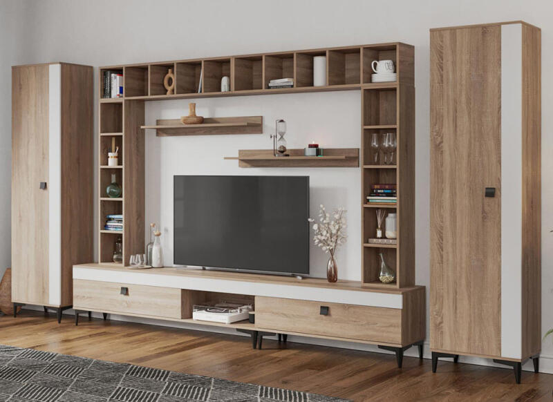 Rafael Nappali Szekrénysor X. Rafael Nappali Szekrénysorunk egy olyan modell, amely minden elvárásnak megfelel. A bútorok skandináv stílusban készültek, a fehér és tölgyfa minta kombinációja eleganciát és természetességet sugároz. A szekrények tágas tárolóhelyet biztosítanak minden tárgyának. Modulárisak, és tetszés szerint, a rendelkezésre álló helytől függően helyezhetők el.