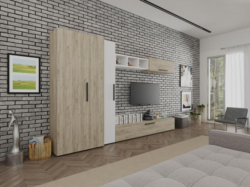 • A nappali 5 modulból áll: Egy 2 ajtós gardróbszekrény, egy függőleges váz, egy felső vízszintes váz, egy fiókos szekrény és egy dísztár