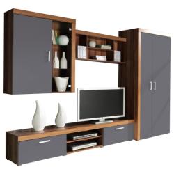 Különleges, karakteres szilva és grafit színű Samba nappali bútor szett modern vitrines, polcos elemekkel, praktikus, lehajtható ajtajú tévé állvánnyal. A Samba nappali szett elemei: szilva-grafit színű tévé állvány, kétajtós akasztós szekrény, vitrines fali szekrény, fali polc. Igény szerint hozzá illő komóddal is rendelhető.