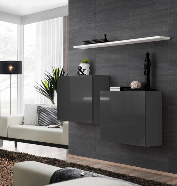 SWITCH 26 szekrénysor SB1 szürke-fehér SWITCH 26 SB1 szekrénysorunk kis helyigényének köszönhetően bárhova könnyen elhelyezhető. Matt corpusza és fényes frontja mégi elengáns külsőt kölcsönöz kis mérete ellenére. Méretei: 2db fali szekrény Hossz: 60 cm Magasság: 60 cm Mélység: 30 cm 1 db lengőpolc Hossz: 120 cm Magasság: 2,2 cm Mélység: 20 cm