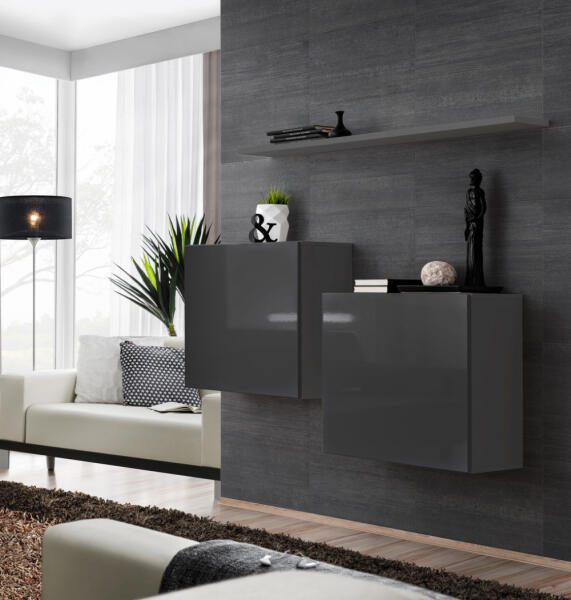 SWITCH 26 szekrénysor SB1 szürke SWITCH 26 SB1 szekrénysorunk kis helyigényének köszönhetően bárhova könnyen elhelyezhető. Matt corpusza és fényes frontja mégi elengáns külsőt kölcsönöz kis mérete ellenére. Méretei: 2db fali szekrény Hossz: 60 cm Magasság: 60 cm Mélység: 30 cm 1 db lengőpolc Hossz: 120 cm Magasság: 2,2 cm Mélység: 20 cm
